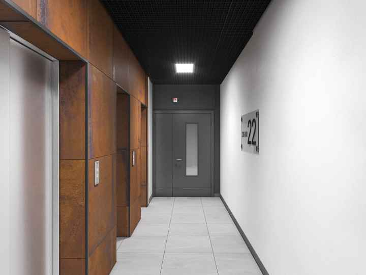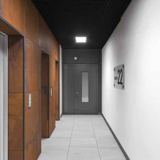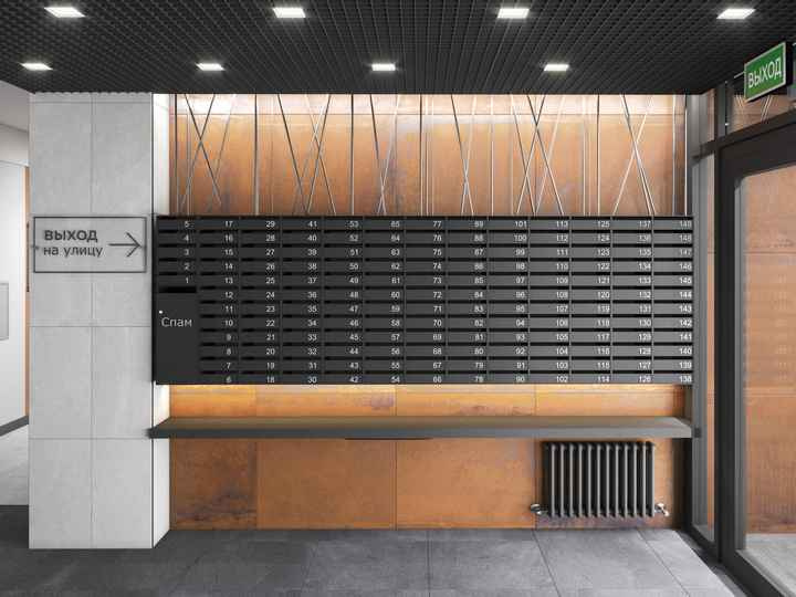 Отделка мест общего пользования выполнена по индивидуальному дизайн-проекту. Предусмотрена наглядная система навигации в холлах и между этажами. В парадной установлены светопрозрачные входные группы, вход в подъезд возможен с двух сторон здания — со стороны улицы и со стороны двора.